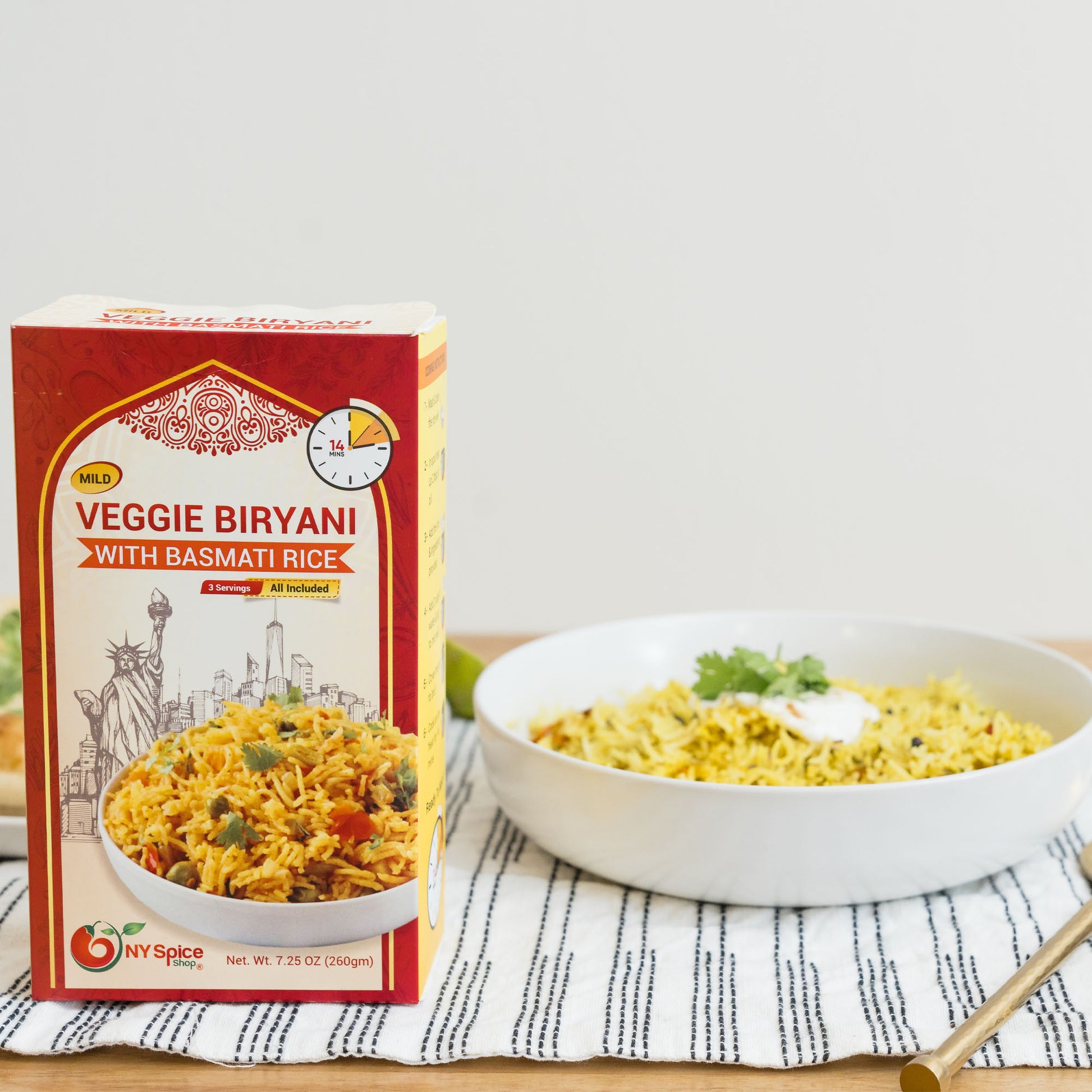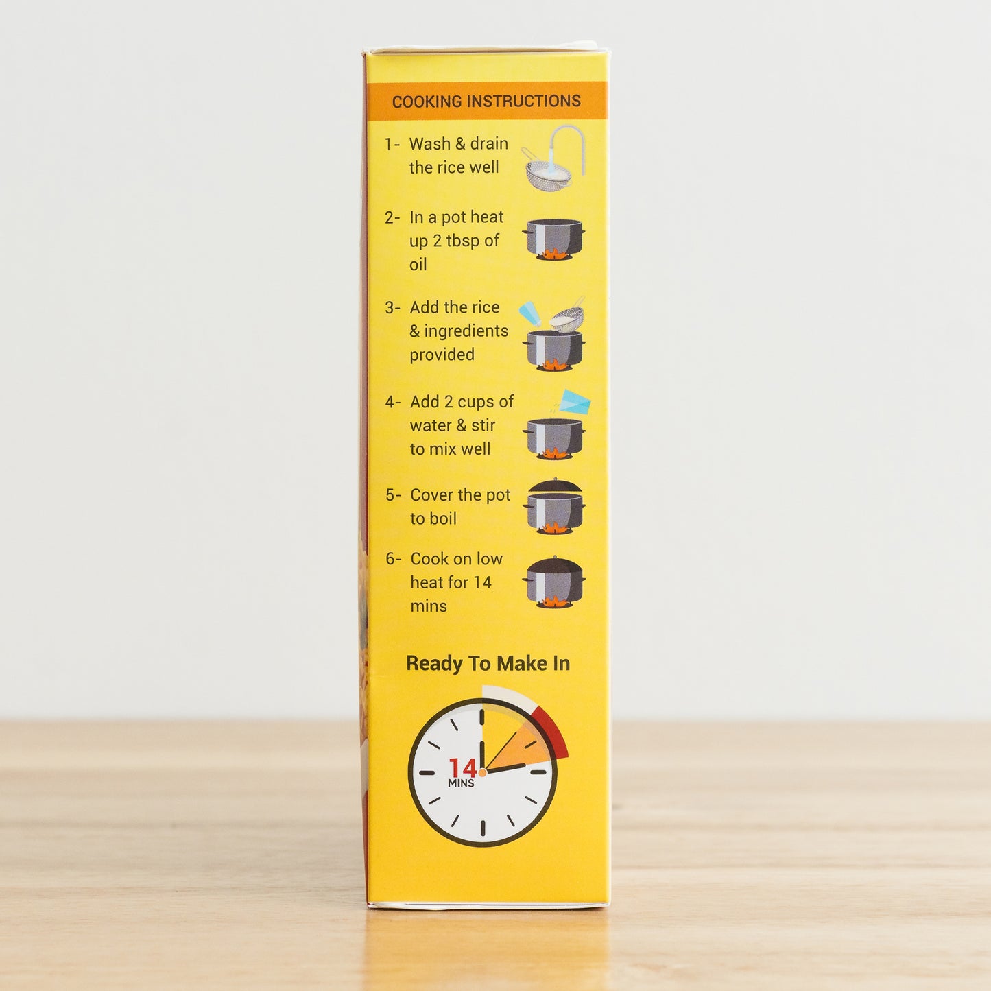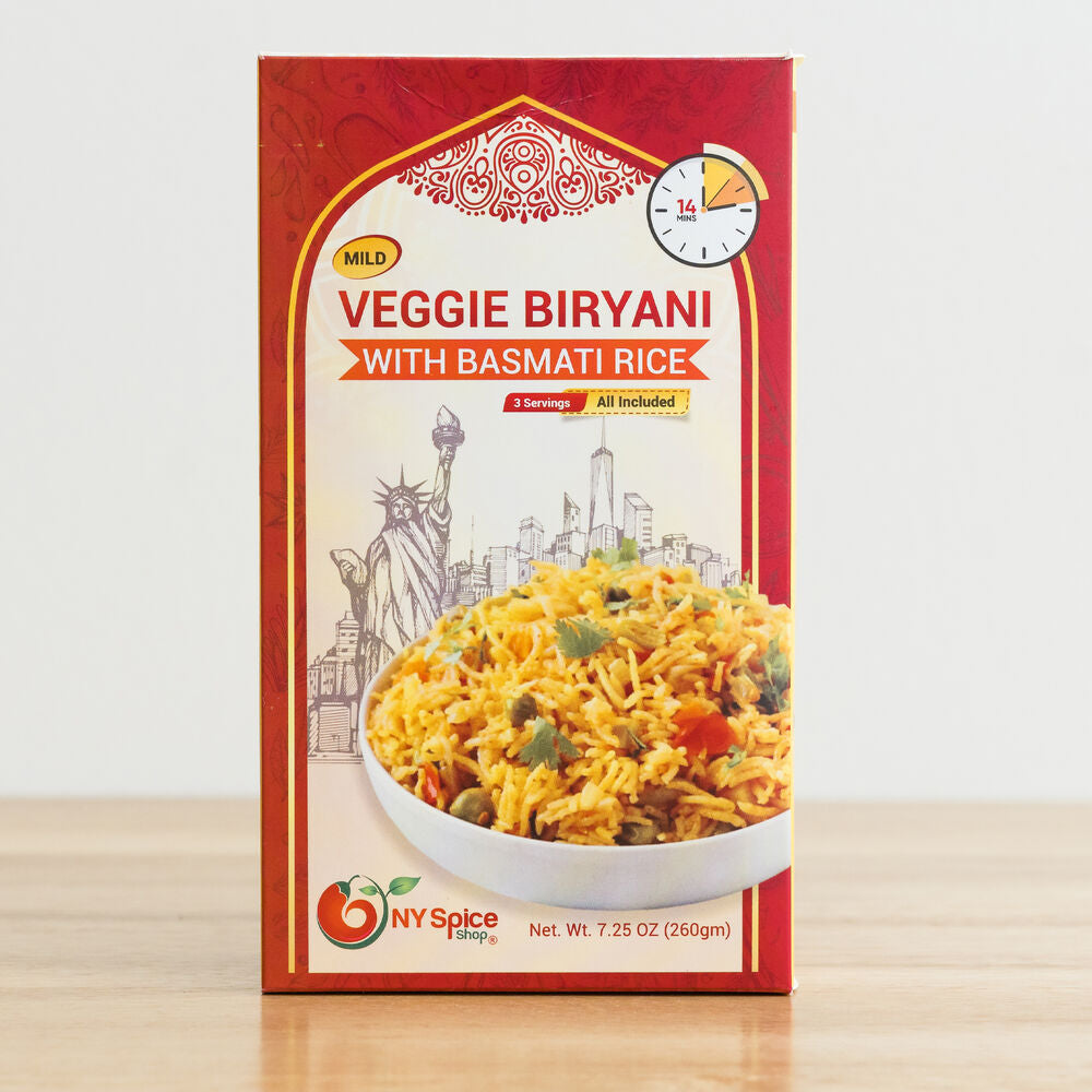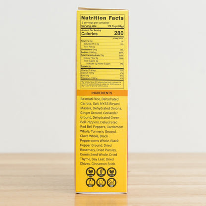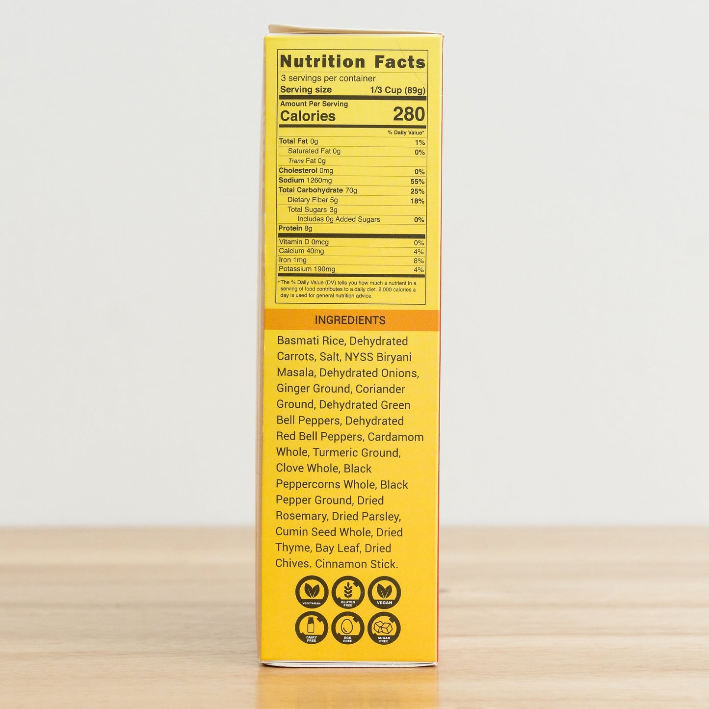 Basmati Rice, Dehydrated Carrots, Salt, NYSS Biryani Masala, Dehydrated Onions, Ginger Ground, Coriander Ground, Dehydrated Green Bell Peppers, Dehydrated Red Bell Peppers, Cardamom Whole, Black Peppercorn Whole, Black Pepper Ground, Dried Rosemary, Dried Parsley, Cumin Seed Whole, Dried Thyme, Bay Leaf, Dried Chives, Cinnamon Stick.