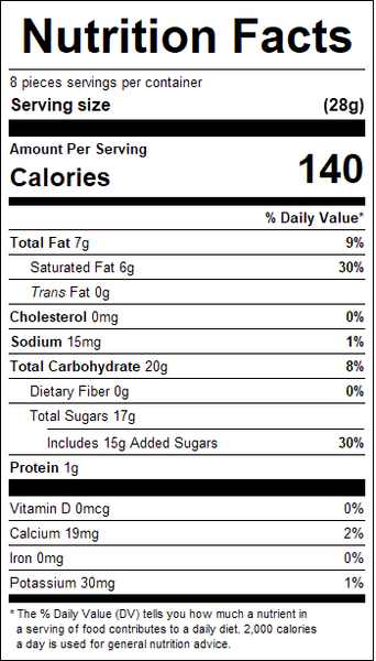 Ingredients: Confectionery Coatings (Sugar, Vegetable Oils [Palm Kernel, Hydrogenated Palm Kernel& Palm], Whey Powder, Nonfat Dry Milk, Whole Milk Solids, Sorbitan Monostearate, Polysorbate 60, Soy Lecithin [Emulsifier], Vanillin [Artificial Flavoring], Natural Flavor), Nonpareils (Sugar, Corn Starch, Confectioner'S Glaze, Carnauba Wax), Artificial Color [Blue 1 Lake, Red 40 Lake, Yellow 5 Lake], Salt, Natural Peppermint Flavor.