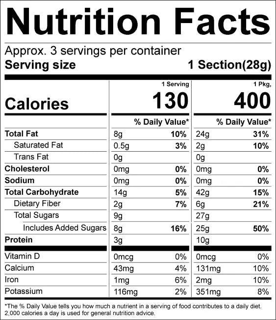 Allergen Information: Contains Tree Nuts. Shares equipment with peanuts, tree nuts, wheat, milk, soy, eggs, & sesame.