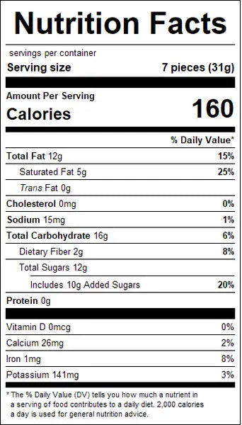 Dark Chocolate (Sugar, Chocolate Liquor, Cocoa Butter, Chocolate Liquor Processed With Alkali, Butterfat, Soy Lecithin [An Emulsifier], Natural Vanilla Flavor, Salt), Almonds, Confectioners Glaze, Water, Gum Arabic, Modified Starch (Tapioca), Coconut Oil, Canola Oil, Sea Salt.