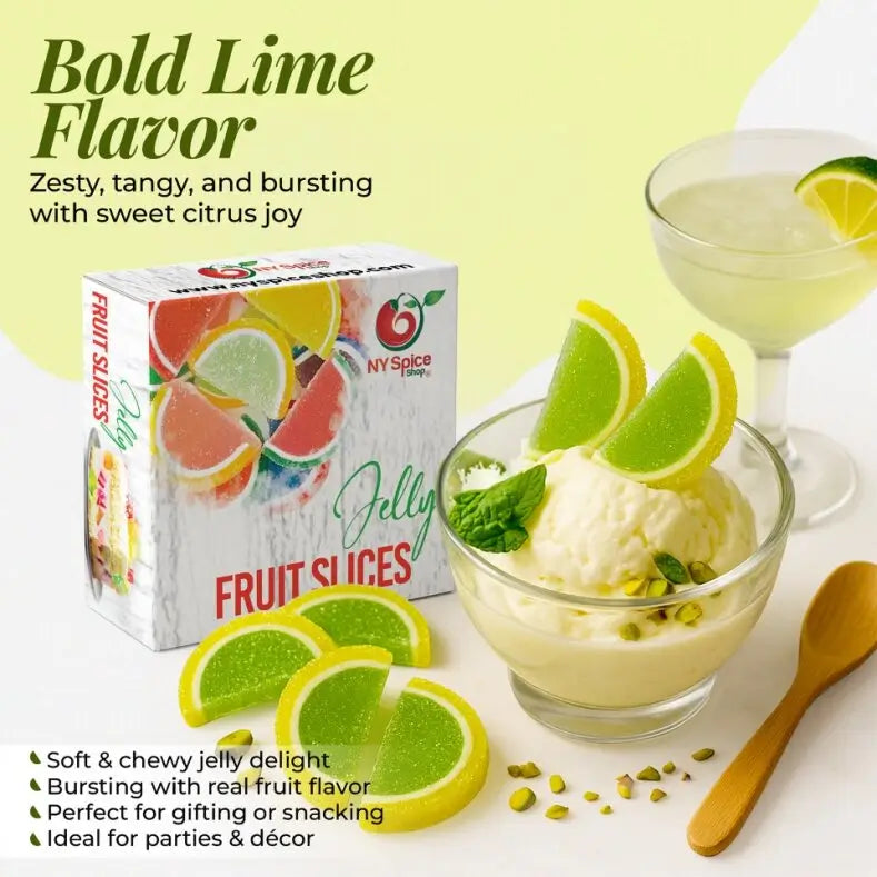 Key Lime Jelly Fruit Slices from NY Spice Shop is a sweet and tangy treat that your customers will love for snacking and decorating desserts. These half-moon-shaped jelly candies are sanded with sugar for added flavor and texture. They are great for garnishing desserts, such as cakes and of course, key lime pie. Intensely flavored with a soft, chewy bite, Key Lime Jelly Fruit Slices are treasured for their unique taste and texture.