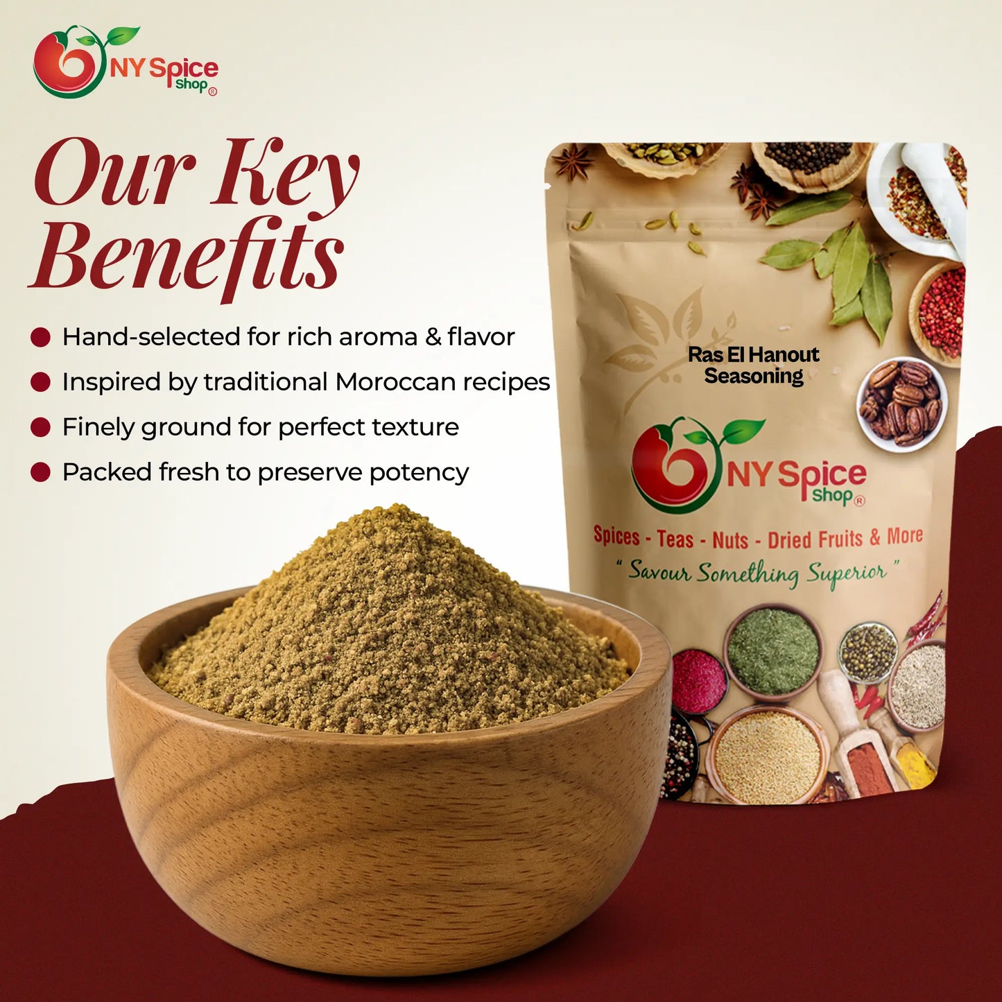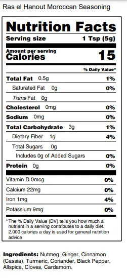 Ingredients: Nutmeg, Ginger, cinnamon, Turmeric, Coriander, Black Pepper, Allspice, Cloves, Cardamom.