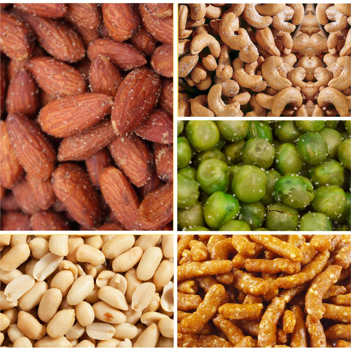 Almonds Roasted Salted, Peanuts Roasted Salted, Cashews Roasted Salted, Green Peas Roasted Salted, Sesame Sticks Roasted Salted