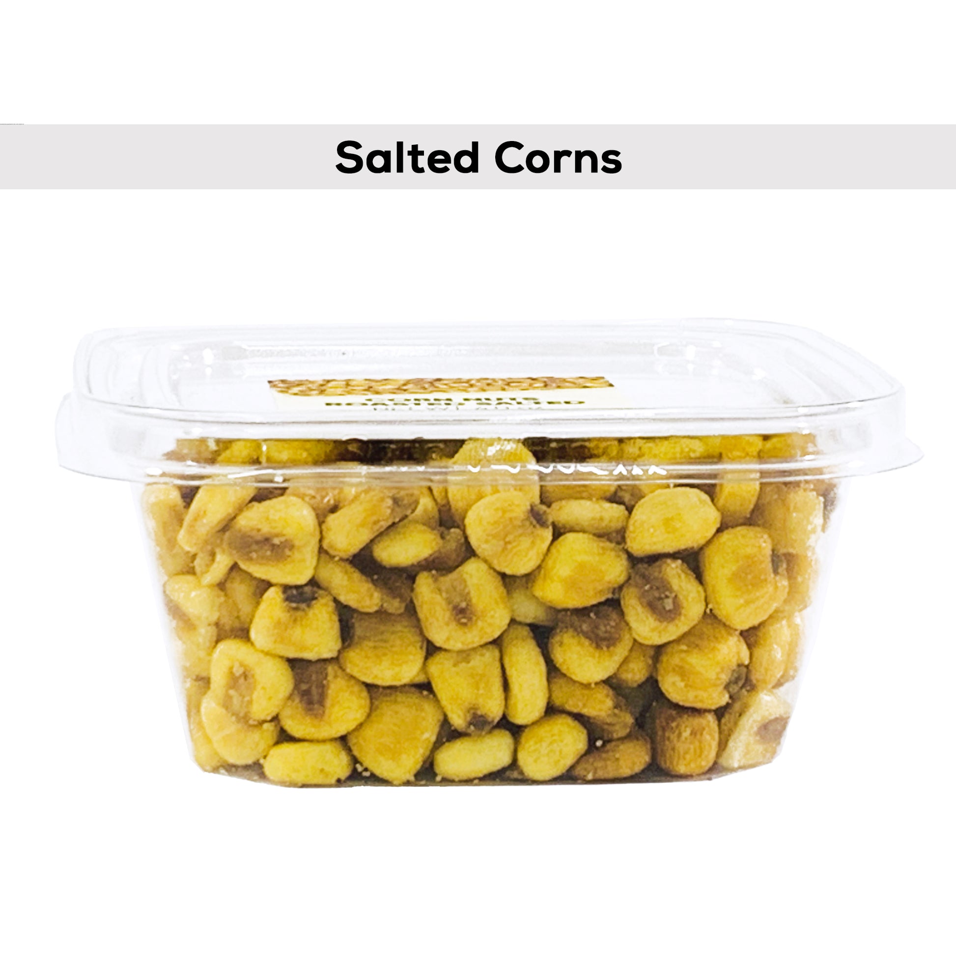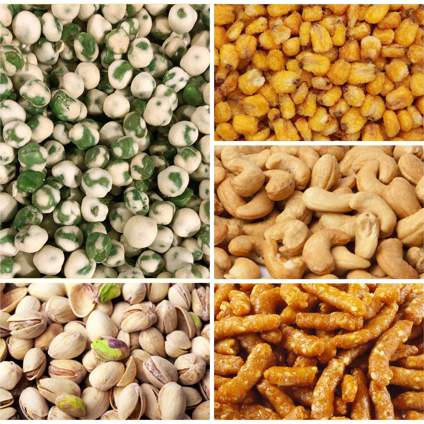 Wasabi Green Peas, Pistachios Salted, Corn Nuts Salted, Cashews Roasted Salted, Garlic Sesame Sticks