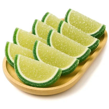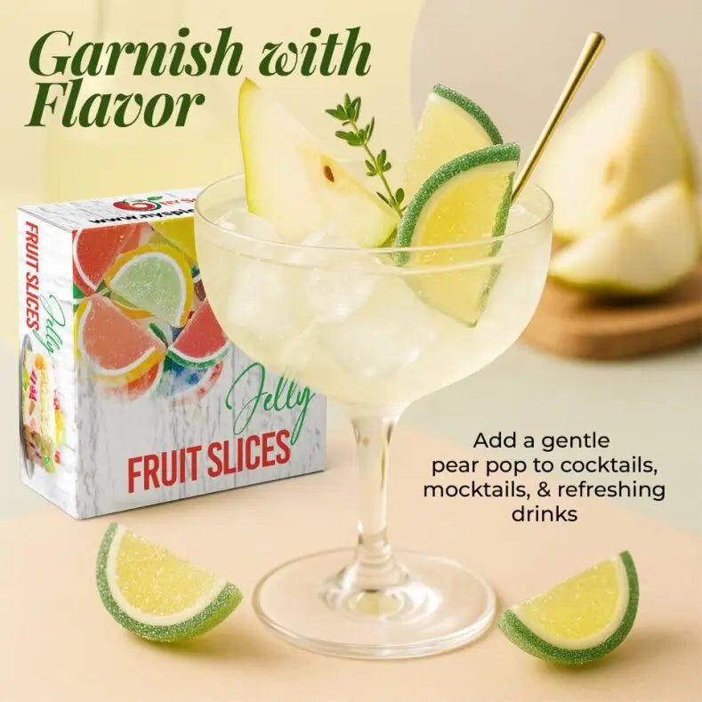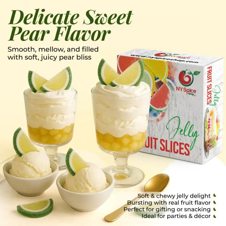 Sweet Pear Jelly Fruit Slices from NY Spice Shop are tasty, attractive, and versatile. The flavor and texture make these slices the kind of snacks that customers purchase by the bagful. But their pleasing color and shape make them ideal for decorative purposes like candy buffets, drink garnishes, and merchandising displays.