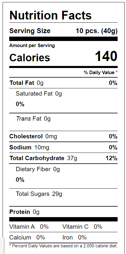 Corn Syrup, Sugar, Dextrose, Corn Starch-Modified, Malic Acid, Citric Acid, Artificial Flavor, Carnauba Wax, Beeswax, Confectioner's Glaze, Red #3, Red #40.