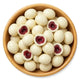 Premium whole dried Bing cherries wrapped in milk chocolate, cherry red couverture then dipped in white cocoa butter. Make our white chocolate-covered cherries the final topping of a perfect day. Succulent dried Bing cherries wrapped in creamy white chocolate.