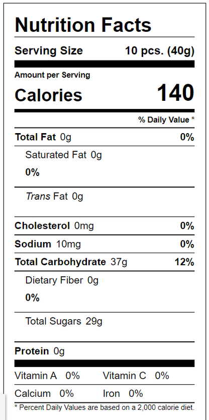 Corn Syrup, Sugar, Dextrose, Corn Starch-Modified, Malic Acid, Citric Acid, Natural, and Artificial Flavor, Carnauba Wax, Beeswax, Confectioner's Glaze, Blue #1.